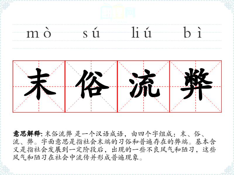 末俗流弊 是一个汉语成语,由四个字组成:末、俗、流、弊。字面意思是指社会末端的俗和普遍存在的弊端。基本含义是指社会发展到一定阶段后,出现的一些不良风气和陋,这些风气和陋*在社会中流传并形成普遍现象。