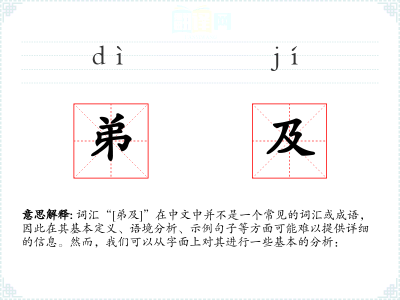 词汇“[弟及]”在中文中并不是一个常见的词汇或成语,因此在其基本定义、语境分析、示例句子等方面可能难以提供详细的信息。然而,我们可以从字面上对其进行一些基本的分析:
