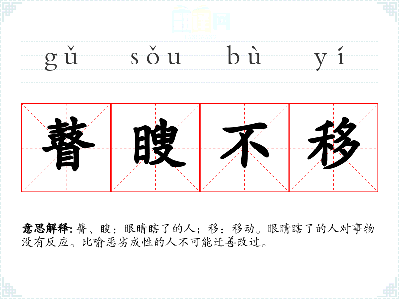 瞽、瞍:眼睛瞎了的人;移:移动。眼睛瞎了的人对事物没有反应。比喻恶劣成性的人不可能