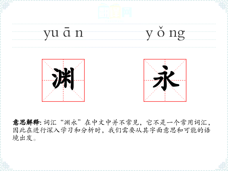 词汇“渊永”在中文中并不常见,它不是一个常用词汇,因此在进行深入学习和分析时,我们需要从其字面意思和可能的语境出发。