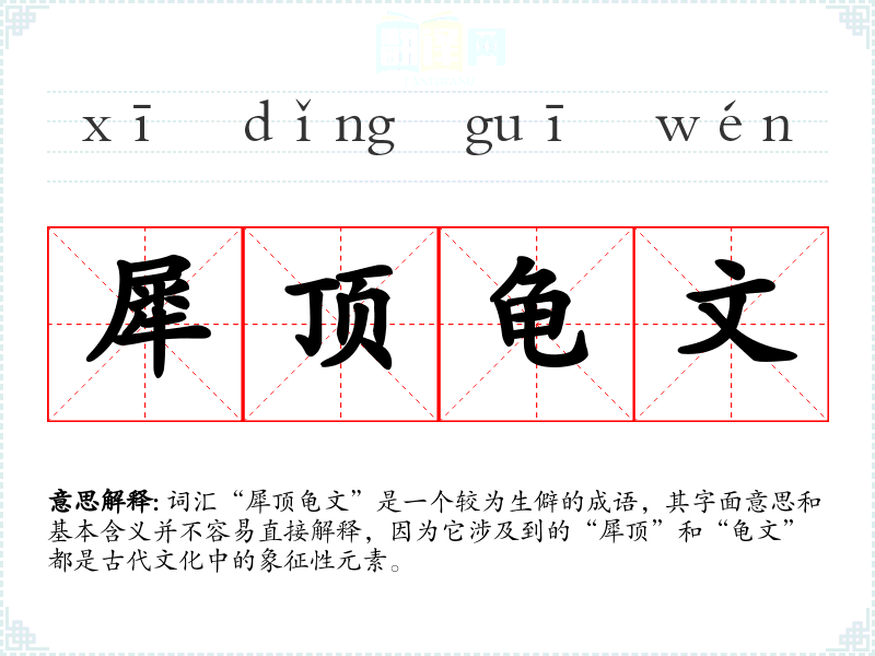 词汇“犀顶龟文”是一个较为生僻的成语,其字面意思和基本含义并不容易直接解释,因为它涉及到的“犀顶”和“龟文”都是古代文化中的象征性元素。