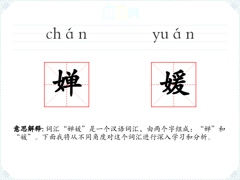 词汇“婵媛”是一个汉语词汇,由两个字组成:“婵”和“媛”。下面我将从不同角度对这个词汇进行深入学*和分析。