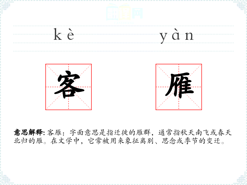 - 专业领域:在鸟类学或生态学中,“客雁”可能指特定的迁徙鸟类,如大雁。