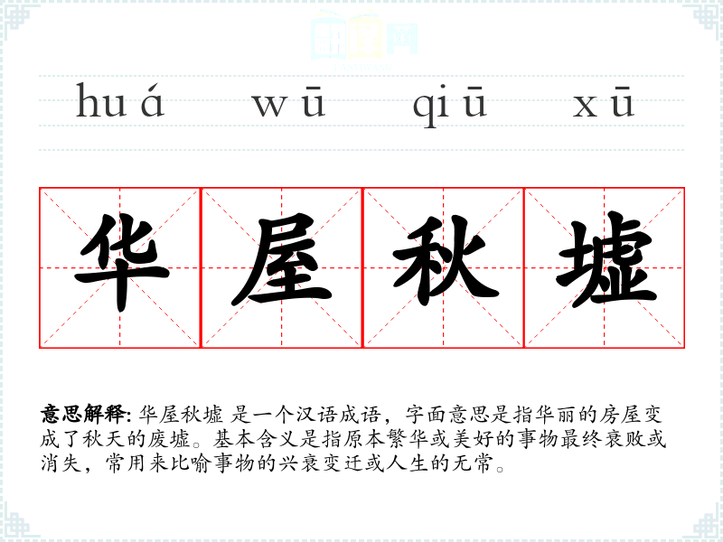 华屋秋墟 是一个汉语成语,字面意思是指华丽的房屋变成了秋天的废墟。基本含义是指原本繁华或美好的事物最终衰败或消失,常用来比喻事物的兴衰变迁或人生的无常。