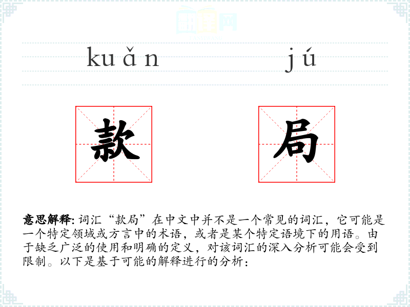 词汇“款局”在中文中并不是一个常见的词汇,它可能是一个特定领域或方言中的术语,或者是某个特定语境下的用语。由于缺乏广泛的使用和明确的定义,对该词汇的深入分析可能会受到限制。以下是基于可能的解释进行的分析: