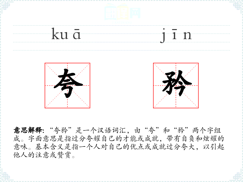 “夸矜”一词的词源可以追溯到古代汉语,其中“夸”字有夸大、夸耀的意思,“矜”字则有自负、自夸的含义。随着时间的推移,这两个字结合在一起,形成了现代汉语中的“夸矜”一词,用以描述过分自夸的行为。