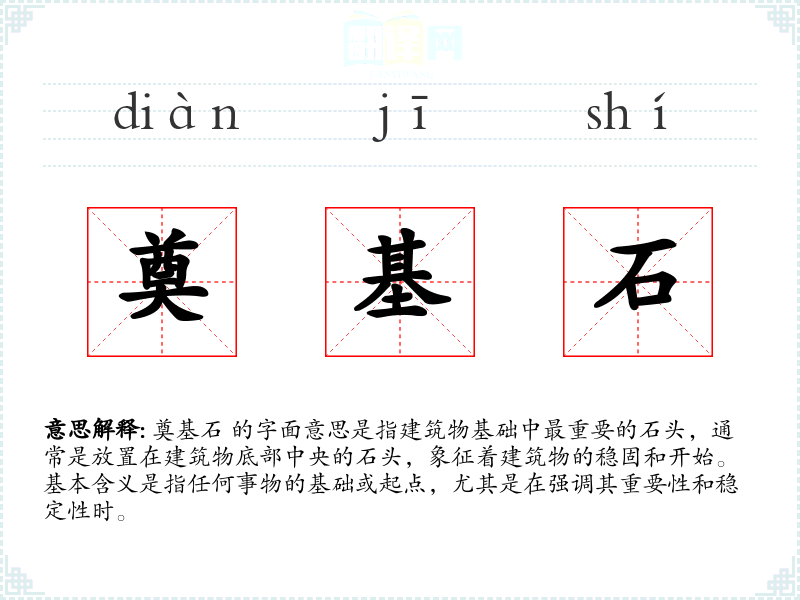奠基石 的字面意思是指建筑物基础中最重要的石头,通常是放置在建筑物底部中央的石头,象征着建筑物的稳固和开始。基本含义是指任何事物的基础或起点,尤其是在强调其重要性和稳定性时。