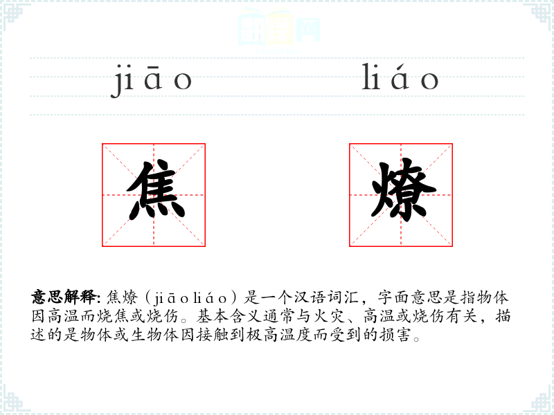 焦燎(jiāo liáo)是一个汉语词汇,字面意思是指物体因高温而烧焦或烧伤。基本含义通常与火灾、高温或烧伤有关,描述的是物体或生物体因接触到极高温度而受到的损害。
