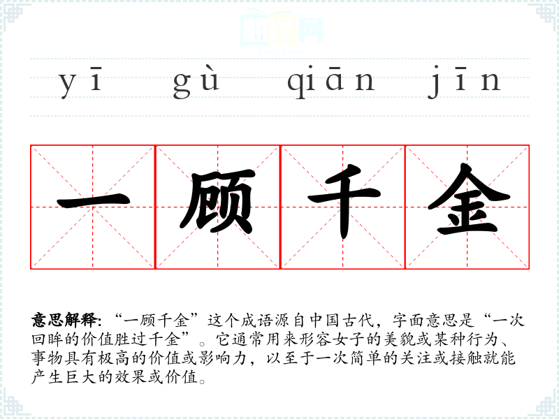“一顾千金”这个成语源自**古代,字面意思是“一次回眸的价值胜过千金”。它通常用来形容女子的美貌或某种行为、事物具有极高的价值或影响力,以至于一次简单的关注或接触就能产生巨大的效果或价值。
