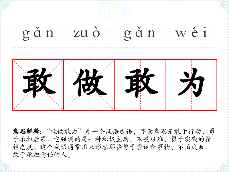 “敢做敢为”是一个汉语成语,字面意思是敢于行动,勇于承担后果。它强调的是一种积极主动、不畏艰难、勇于实践的精神态度。这个成语通常用来形容那些勇于尝试新事物、不怕失败、敢于承担责任的人。