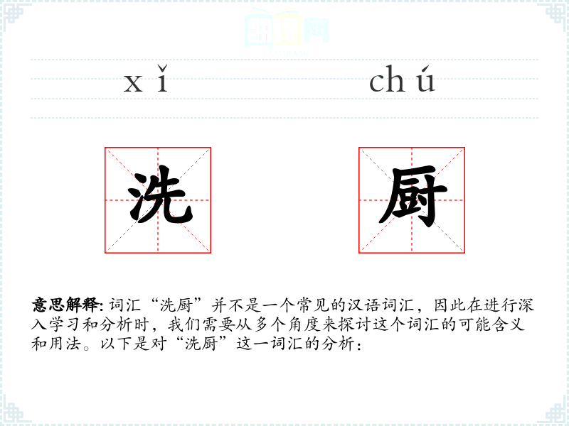 词汇“洗厨”并不是一个常见的汉语词汇,因此在进行深入学习和分析时,我们需要从多个角度来探讨这个词汇的可能含义和用法。以下是对“洗厨”这一词汇的分析: