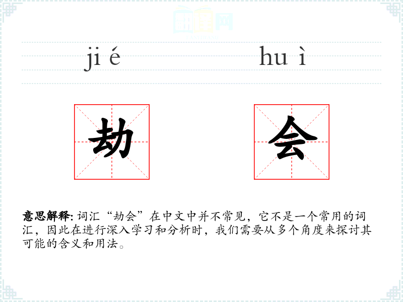 词汇“劫会”在中文中并不常见,它不是一个常用的词汇,因此在进行深入学*和分析时,我们需要从多个角度来探讨其可能的含义和用法。