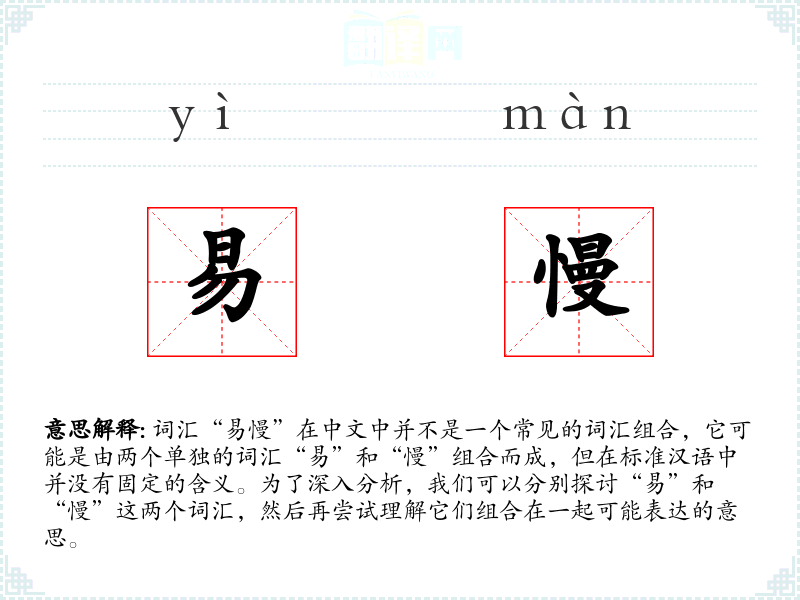 - 在英语中,“易”可以对应“easy”,“慢”可以对应“slow”。组合起来,“易慢”可能没有直接对应的词汇,但可以理解为“easy and slow”。