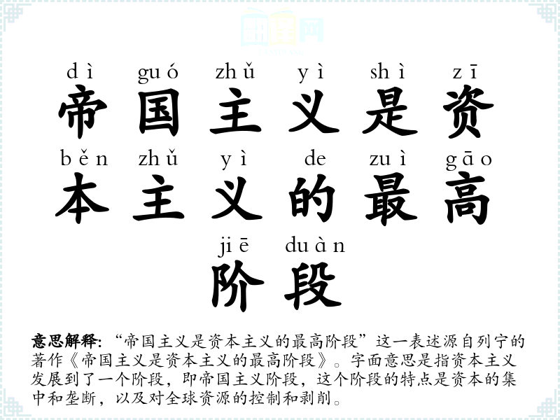 “帝国主义是资本主义的最高阶段”这一表述源自列宁的著作《帝国主义是资本主义的最高阶段》。字面意思是指资本主义发展到了一个阶段,即帝国主义阶段,这个阶段的特点是资本的集中和垄断,以及对全球资源的控制和剥削。