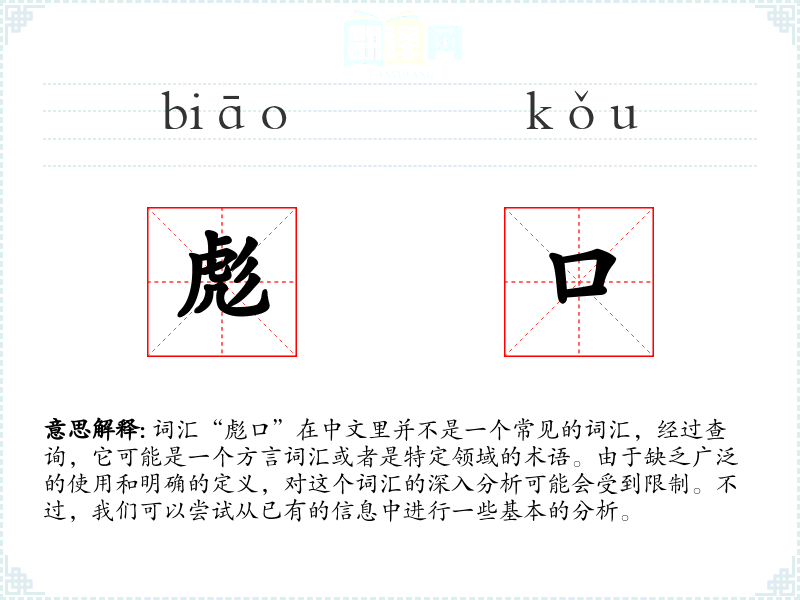 词汇“彪口”在中文里并不是一个常见的词汇,经过查询,它可能是一个方言词汇或者是特定领域的术语。由于缺乏广泛的使用和明确的定义,对这个词汇的深入分析可能会受到限制。不过,我们可以尝试从已有的信息中进行一些基本的分析。