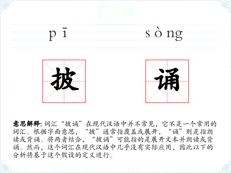 词汇“披诵”在现代汉语中并不常见,它不是一个常用的词汇。根据字面意思,“披”通常指覆盖或展开,“诵”则是指朗读或背诵。将两者结合,“披诵”可能指的是展开文本并朗读或背诵。然而,这个词汇在现代汉语中几乎没有实际应用,因此以下的分析将基于这个假设的定义进行。