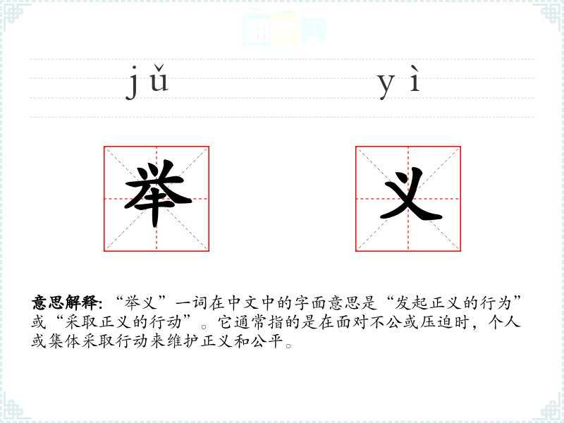 “举义”一词在中文中的字面意思是“发起正义的行为”或“采取正义的行动”。它通常指的是在面对不公或压迫时,个人或集体采取行动来维护正义和公平。