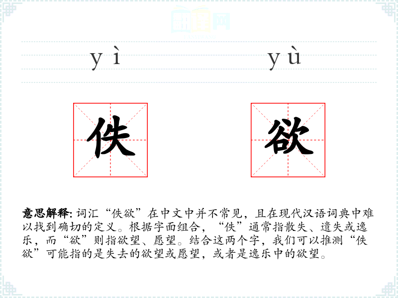 - 词源:“佚”源自古代汉语,意为散失、遗失;“欲”源自古代汉语,意为欲望、愿望。
