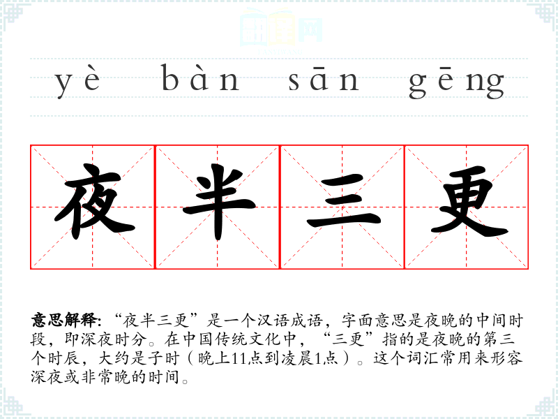 “夜半三更”是一个汉语成语,字面意思是夜晚的中间时段,即深夜时分。在**传统文化中,“三更”指的是夜晚的第三个时辰,大约是子时(晚上11点到凌晨1点)。这个词汇常用来形容深夜或非常晚的时间。
