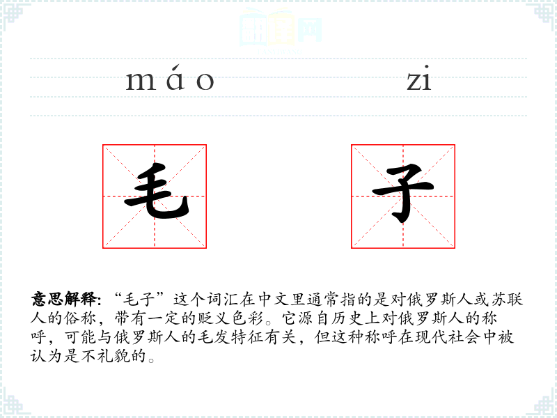 “毛子”这个词汇在中文里通常指的是对俄罗斯人或苏联人的俗称,带有一定的贬义色彩。它源自历史上对俄罗斯人的称呼,可能与俄罗斯人的毛发特征有关,但这种称呼在现代社会中被认为是不礼貌的。