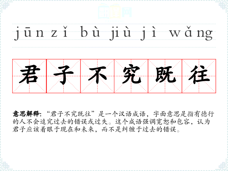 “君子不究既往”是一个汉语成语,字面意思是指有德行的人不会追究过去的错误或过失。这个成语强调宽恕和包容,认为君子应该着眼于现在和未来,而不是纠缠于过去的错误。