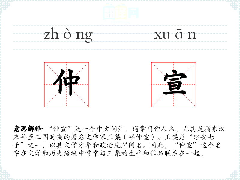 “仲宣”作为人名,其词源直接来源于王粲的字。在古代,人们常常有名和字,字是对名的补充和解释,通常反映了个人的品德、志向或家族期望。随着时间的推移,“仲宣”这个名字在文学和历史领域中被广泛使用,成为王粲的代名词。
