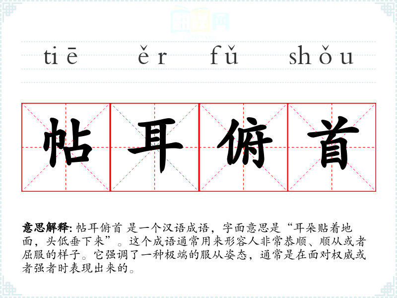 帖耳俯首 是一个汉语成语,字面意思是“耳朵贴着地面,头低垂下来”。这个成语通常用来形容人非常恭顺、顺从或者屈服的样子。它强调了一种极端的服从姿态,通常是在面对权威或者强者时表现出来的。
