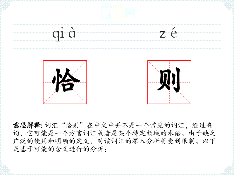 词汇“恰则”在中文中并不是一个常见的词汇,经过查询,它可能是一个方言词汇或者是某个特定领域的术语。由于缺乏广泛的使用和明确的定义,对该词汇的深入分析将受到限制。以下是基于可能的含义进行的分析: