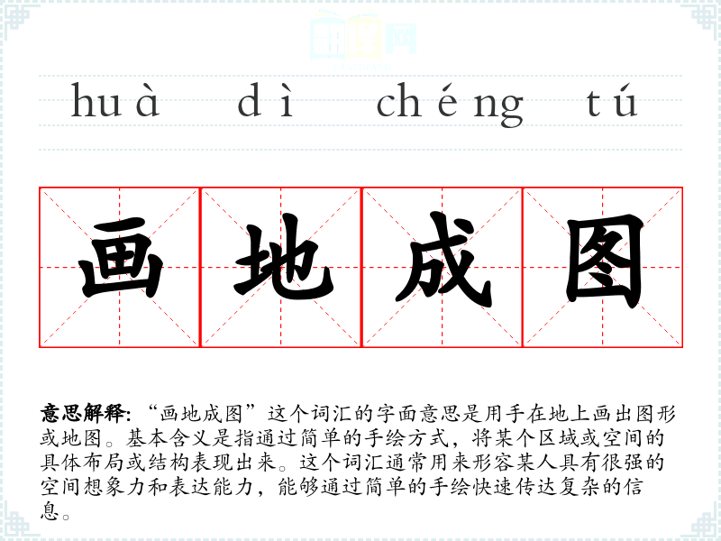 “画地成图”这个词汇的字面意思是用手在地上画出图形或地图。基本含义是指通过简单的手绘方式,将某个区域或空间的具体布局或结构表现出来。这个词汇通常用来形容某人具有很强的空间想象力和表达能力,能够通过简单的手绘快速传达复杂的信息。