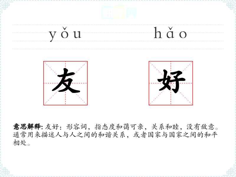 友好:形容词,指态度和蔼可亲,关系和睦,没有敌意。通常用来描述人与人之间的和谐关系,或者国家与国家之间的和平相处。