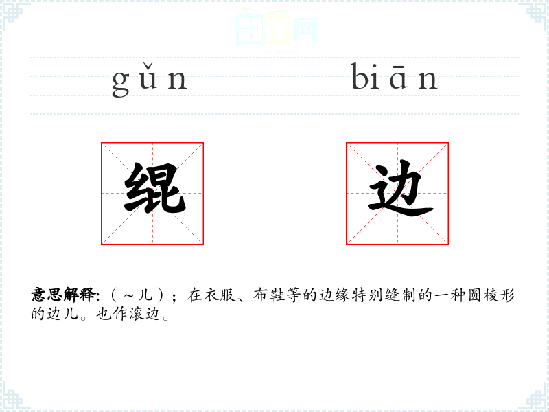 (~儿);在衣服、布鞋等的边缘特别缝制的一种圆棱形的边儿。也作滚边。