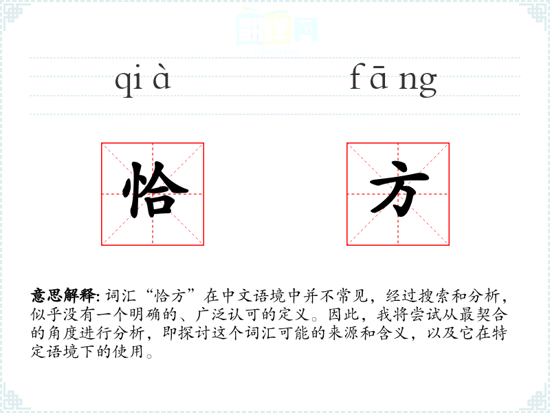 由于“恰方”不是一个标准的中文词汇,我们无法给出一个确切的基本定义。它可能是某个方言词汇、特定行业的术语,或者是某个特定社群中的俚语。