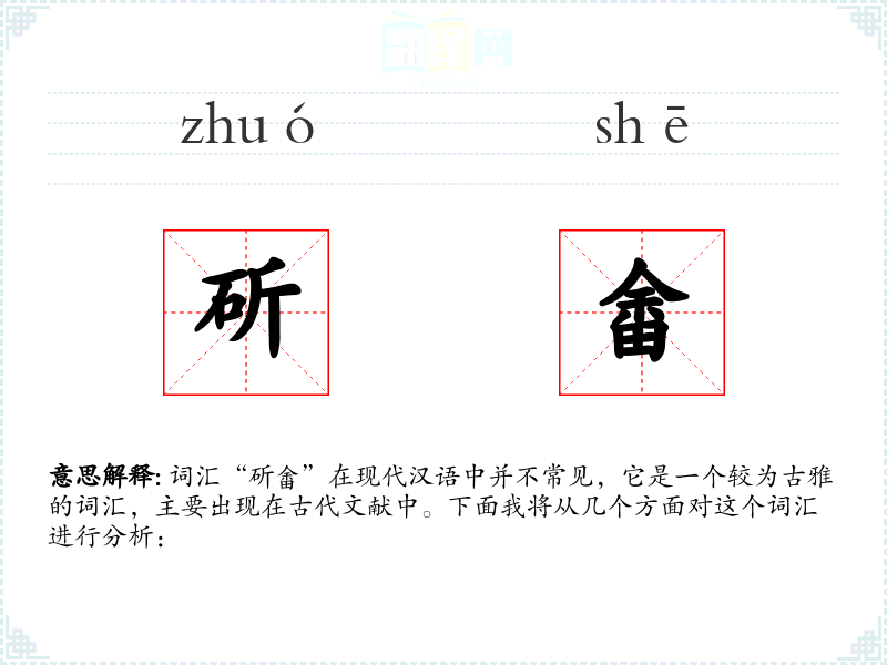 词汇“斫畬”在现代汉语中并不常见,它是一个较为古雅的词汇,主要出现在古代文献中。下面我将从几个方面对这个词汇进行分析: