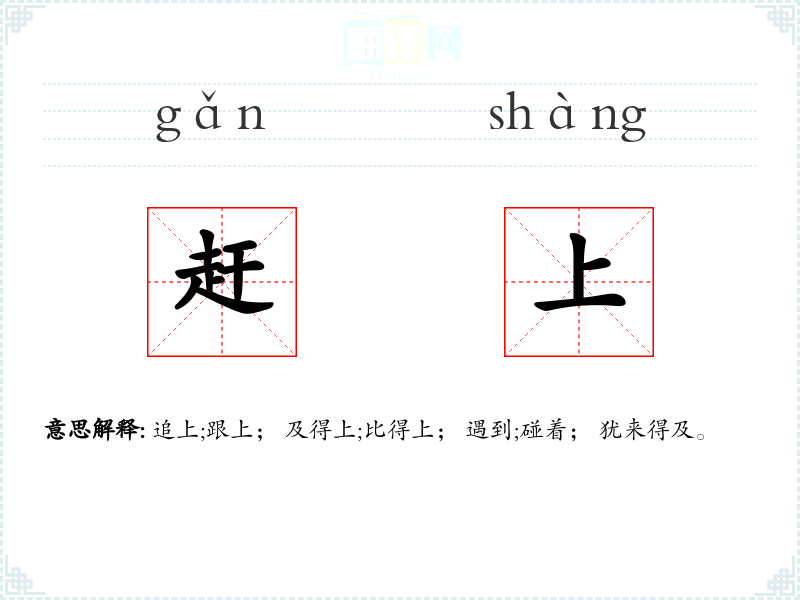 追上;跟上; 及得上;比得上; 遇到;碰着; 犹来得及。