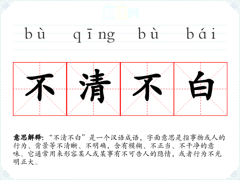 “不清不白”是一个汉语成语,字面意思是指事物或人的行为、背景等不清晰、不明确,含有模糊、不正当、不干净的意味。它通常用来形容某人或某事有不可告人的隐情,或者行为不光明正大。
