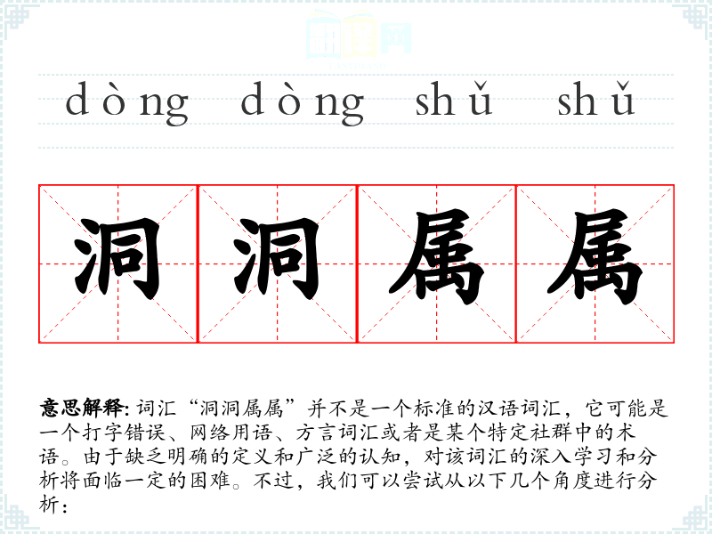 由于“洞洞属属”不是一个标准词汇,我们无法给出其字面意思和基本含义。它可能是由“洞洞”和“属属”两个部分组成,但这两个部分本身也没有明确的含义。