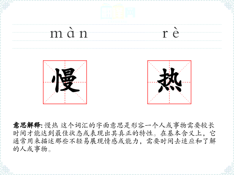 “慢热”这个词汇源自中文,直接翻译为“slow to heat”,形象地描述了需要时间才能“热起来”的状态。在现代汉语中,这个词汇已经广泛应用于描述人的性格和事物的特性。