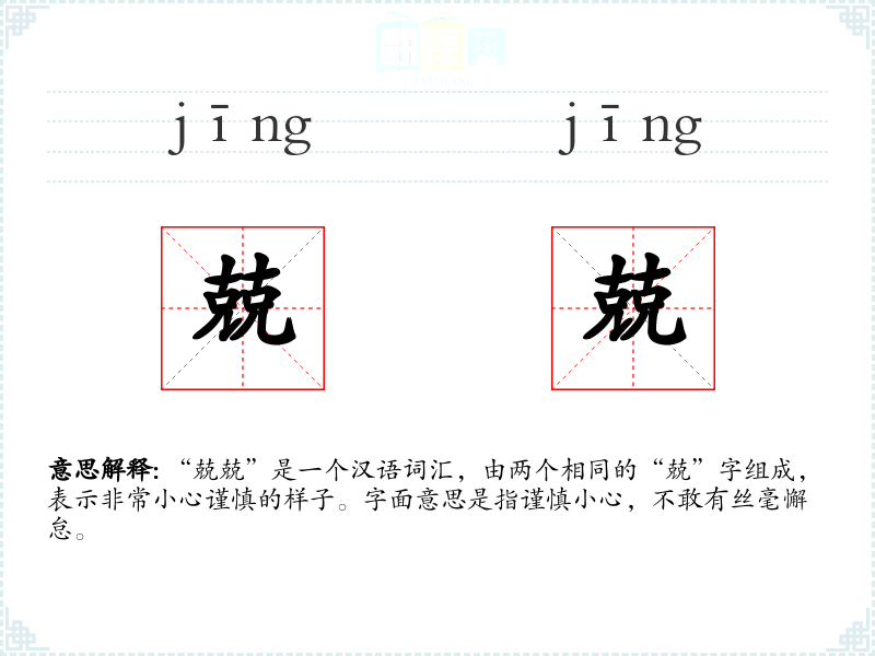 “兢兢”是一个汉语词汇,由两个相同的“兢”字组成,表示非常小心谨慎的样子。字面意思是指谨慎小心,不敢有丝毫懈怠。
