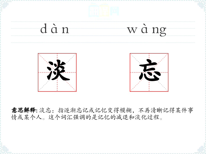 “淡忘”由“淡”和“忘”两个字组成。“淡”原指液体稀*,引申为不浓烈、不明显;“忘”即忘记。两者结合,形成了表示记忆逐渐减退的词汇。