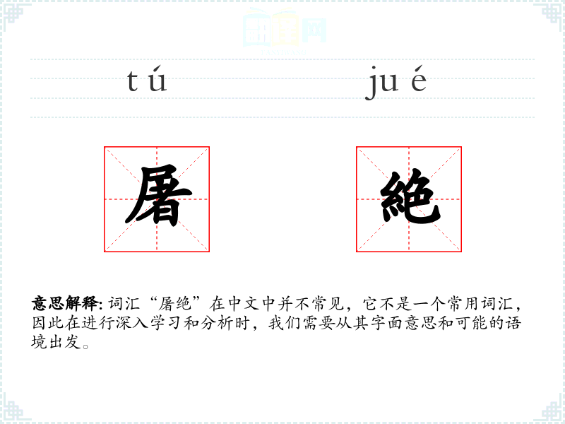 词汇“屠绝”在中文中并不常见,它不是一个常用词汇,因此在进行深入学*和分析时,我们需要从其字面意思和可能的语境出发。