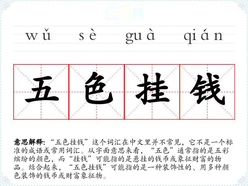 - 反义词:(由于“五色挂钱”不是一个常用词汇,反义词可能不明显,但如果要找一个相对的概念,可能是“单一色调的钱币”或“无装饰的钱币”)