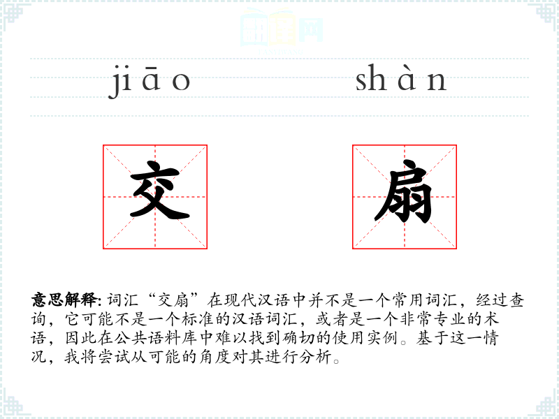 由于“交扇”不是一个常见的词汇,我们无法给出一个确切的基本定义。如果将其拆分为“交”和“扇”两个字,我们可以推测: