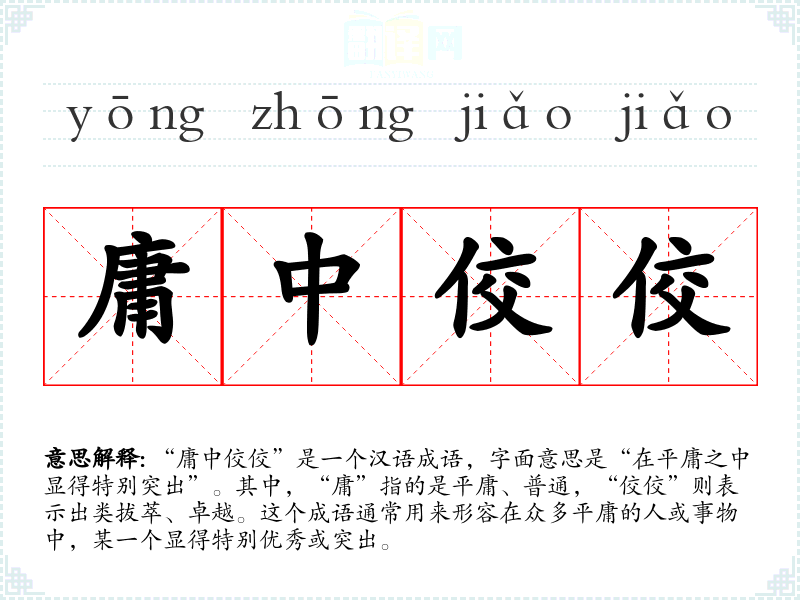 “庸中佼佼”是一个汉语成语,字面意思是“在平庸之中显得特别突出”。其中,“庸”指的是平庸、普通,“佼佼”则表示出类拔萃、卓越。这个成语通常用来形容在众多平庸的人或事物中,某一个显得特别优秀或突出。