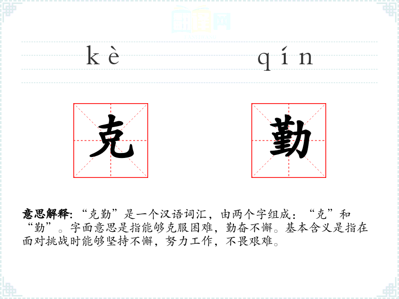 “克勤”是一个汉语词汇,由两个字组成:“克”和“勤”。字面意思是指能够克服困难,勤奋不懈。基本含义是指在面对挑战时能够坚持不懈,努力工作,不畏艰难。