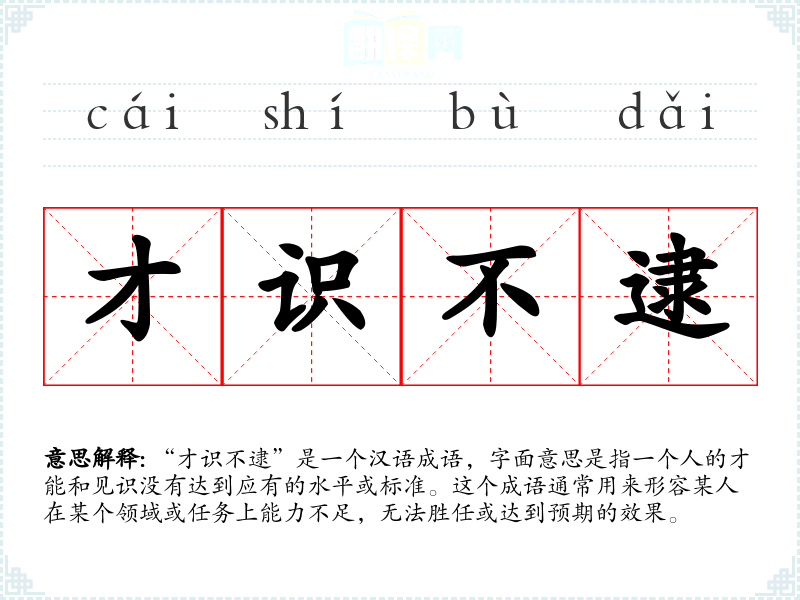 “才识不逮”是一个汉语成语,字面意思是指一个人的才能和见识没有达到应有的水平或标准。这个成语通常用来形容某人在某个领域或任务上能力不足,无法胜任或达到预期的效果。