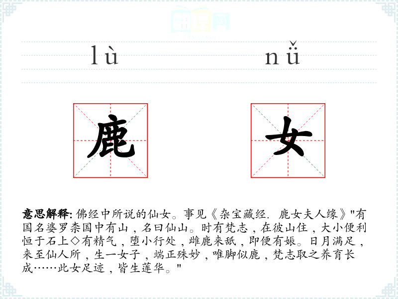 1.佛经中所说的仙女。事见《杂宝藏经.鹿女夫人缘》"有国名婆罗柰国中有山﹐名曰仙山。时有梵志﹐在彼山住﹐大小便利恒于石上◇有精气﹐堕小行处﹐雌鹿来舐﹐即便有娠。日月满足﹐来至仙人所﹐生一女子﹐端正殊妙﹐唯脚似鹿﹐梵志取之养育长成……此女足迹﹐皆生莲华。"