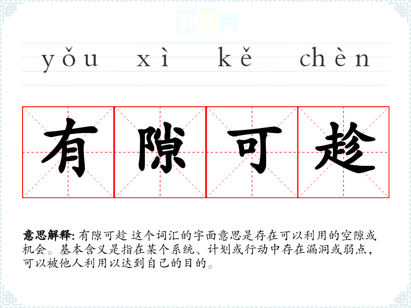 有隙可趁 这个词汇的字面意思是存在可以利用的空隙或机会。基本含义是指在某个系统、计划或行动中存在漏洞或弱点,可以被他人利用以达到自己的目的。