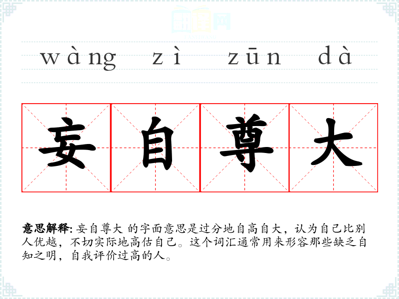 妄自尊大 的字面意思是过分地自高自大,认为自己比别人优越,不切实际地高估自己。这个词汇通常用来形容那些缺乏自知之明,自我评价过高的人。