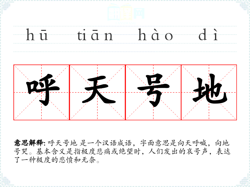呼天号地 是一个汉语成语,字面意思是向天呼喊,向地号哭。基本含义是指极度悲痛或绝望时,人们发出的哀号声,表达了一种极度的悲愤和无奈。