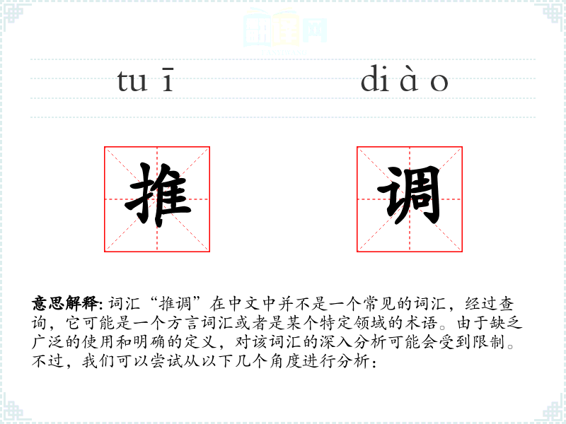 由于“推调”不是一个标准词汇,我们无法总结对该词汇的理解。在语言学习和表达中,我们应当关注那些有明确定义和广泛使用的词汇。